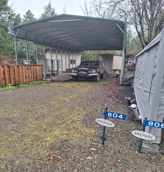 Large flat R.V. area in gravel, tucked behind the large greenery area at front of site. on left side, not in the picture is a 10x20 soft cover in great condition. Plenty of parking for RV, and a boat and covered trailer.