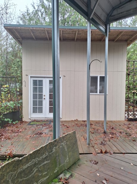 This custom built 12x8 shed is to the top of this site next to Redwood. Shed is in great condition, wired, insulated and paneled. Covered porch with gutters and downspouts solid residential enter door.